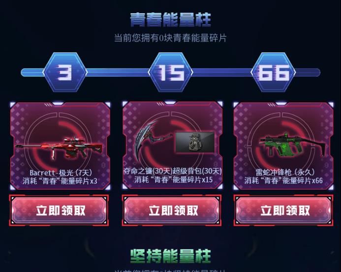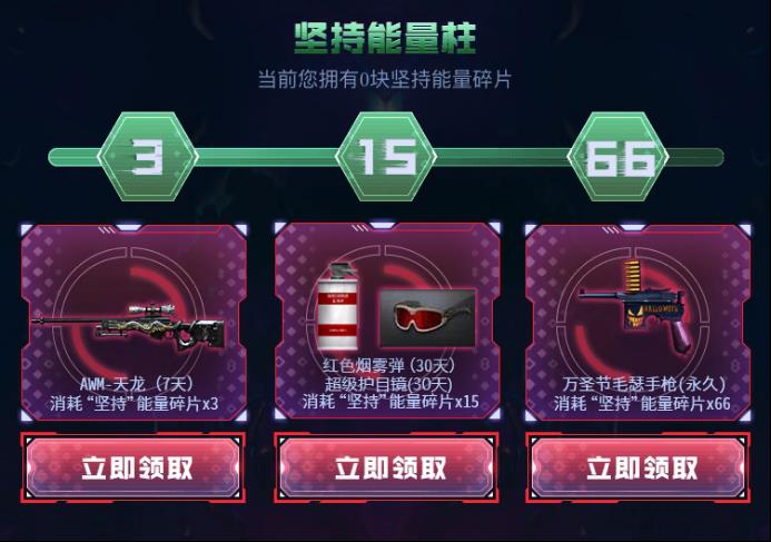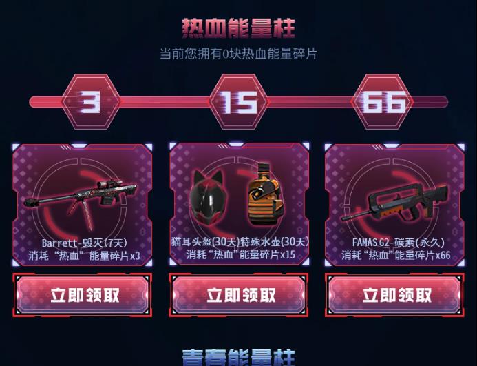 那么提到了这三个主旨,就不得不提活动中三条能量柱了。通过每日游戏收集的不同能量碎片兑换其中的武器道具。能量柱分别以这三个为主题命名,除了常规的期限英雄级武器之外,像猫耳头盔、超级背包、超级护目镜都是极为不错的道具。而最高第三层则就是永久武器道具了,热血能量柱是FAMAS G2-碳素永久,作为穿越火线公测以来资历最早的武器之一,相信很多玩家都已经颇为熟悉了。在之前版本更新中也是出现了它的炫彩皮肤版,如今碳素也是送出永久,小伙伴们不容错过。
