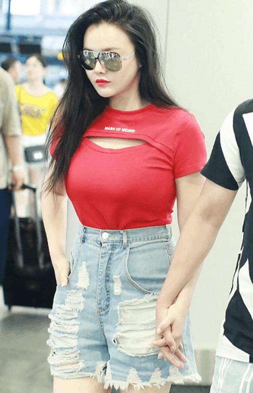 冉莹颖身穿一件红色的T恤搭配破烂的牛仔裤,完全将她的好身材给穿出来了,尽管这一件红色的T恤看上去不是很紧,甚至都有一些松弛的感觉,但是却让冉莹颖穿出了傲人的上围,胸前一个开口设计很美,露出白皙的肌肤,大显时尚感,穿出她迷人的女人味来。