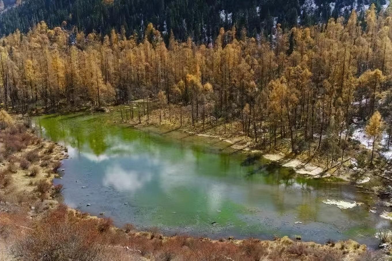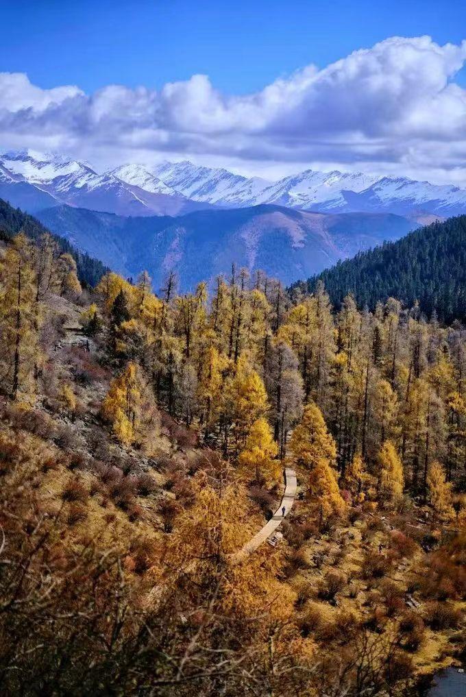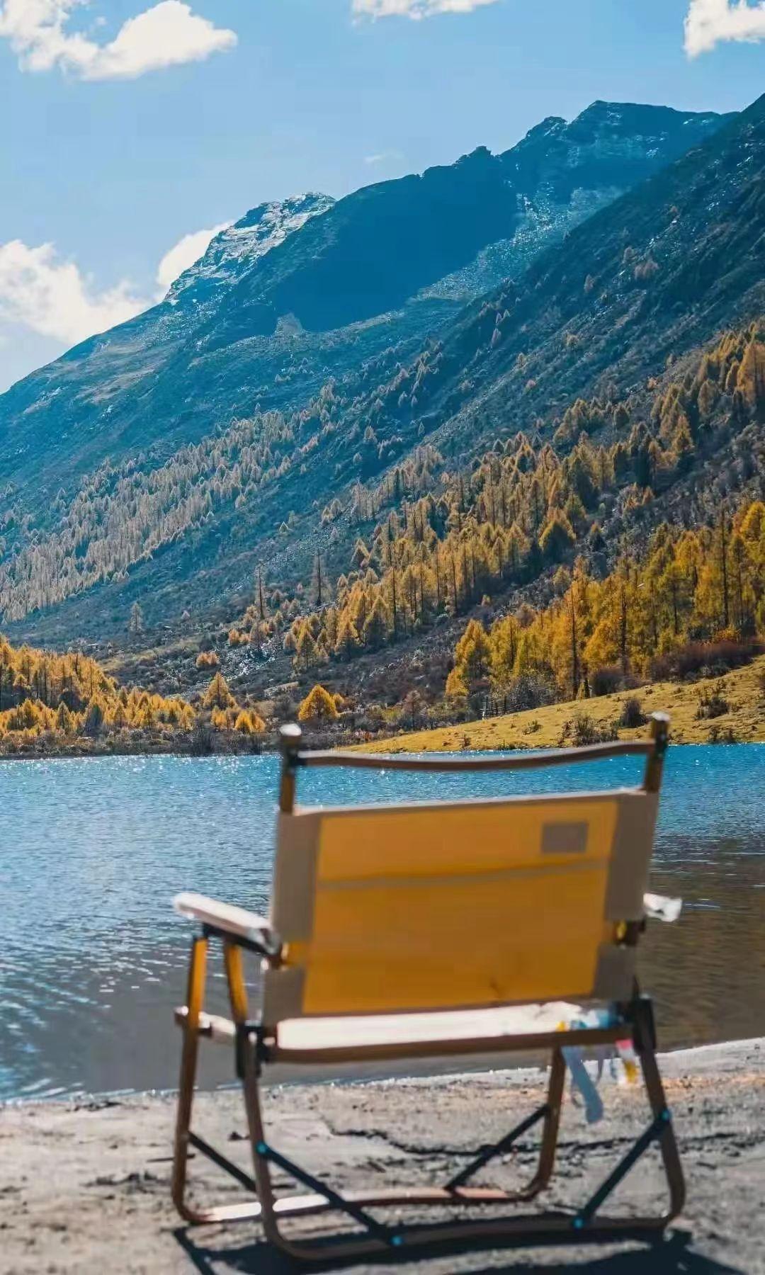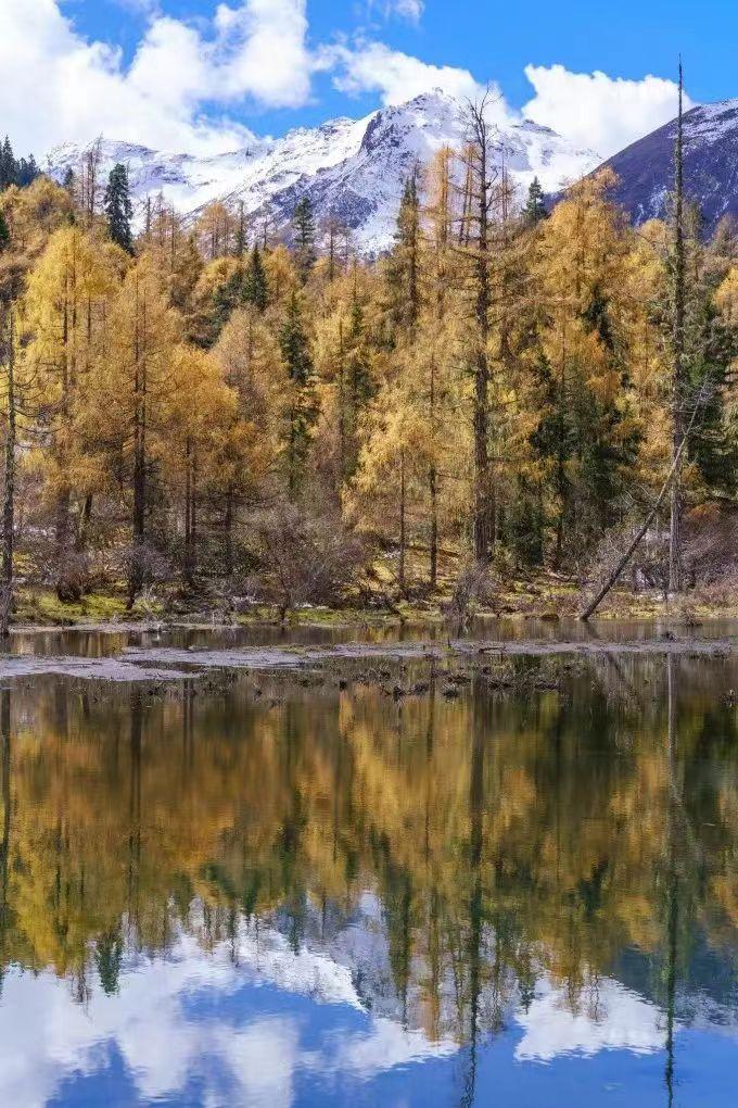 远方的雪山、近处的森林、眼前的海子,以及脚下的草甸,每一处景色都令人如痴如醉。蓝天白云下的森林连着草甸,一湾湾藏在山谷的海子,如同有变色龙的魔力,时而湛蓝、时而绿碧,仰望大山之上,时有秃鹫飞过。