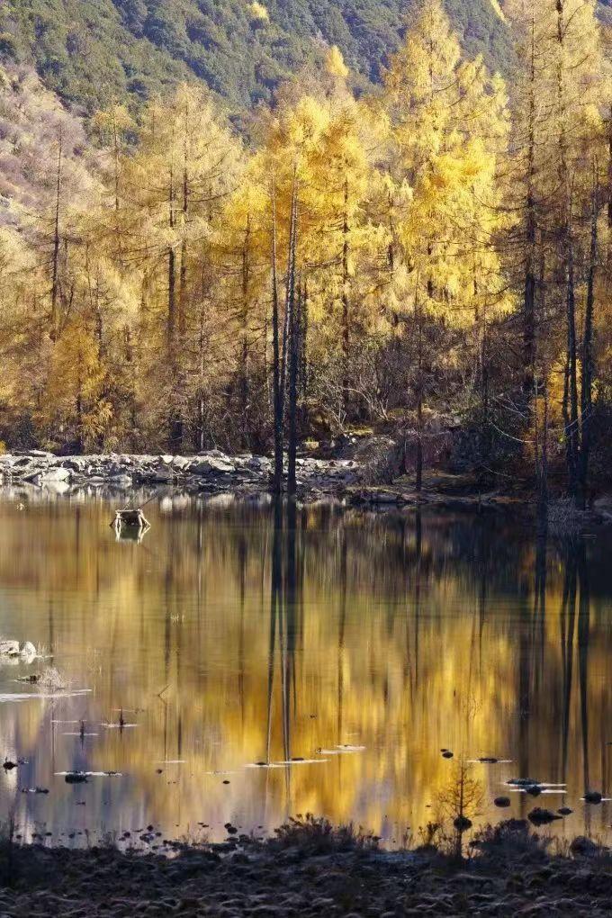漫步于此,被光影交错下的玛嘉沟的美所震慑住,微风吹过,湖水在阳光的照射下形成道道涟漪,与远处的雪山、四周的森林、湖中觅食的牛马组成一幅美丽的画卷。