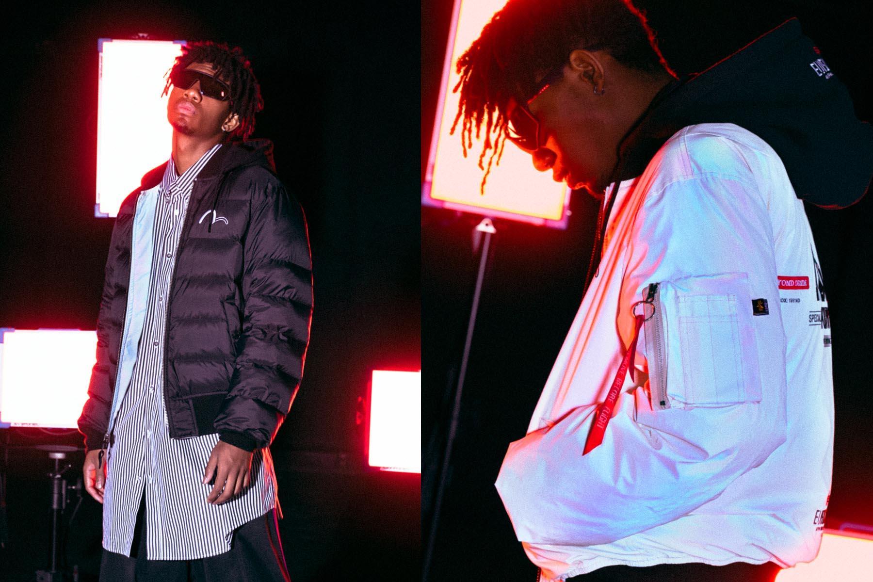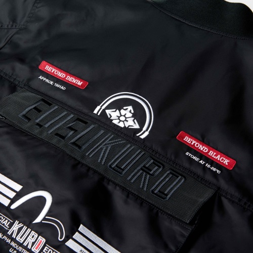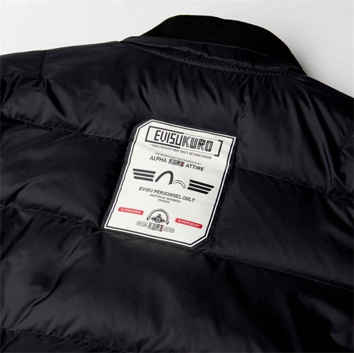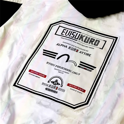 此次EVISUKURO x Alpha Industries双方联名,运用了大量机能元素,大口袋、 抽绳、鱼尾一样不少,防水及反光材料和可拆卸的帽子等要素给与服装不错的功能性,而经典 Alpha式的设计风格——链头上的“REMOVE BEFORE FLIGHT”红色飘带也得以保留。在辅以大量EVISU的刺绣,效果不俗。