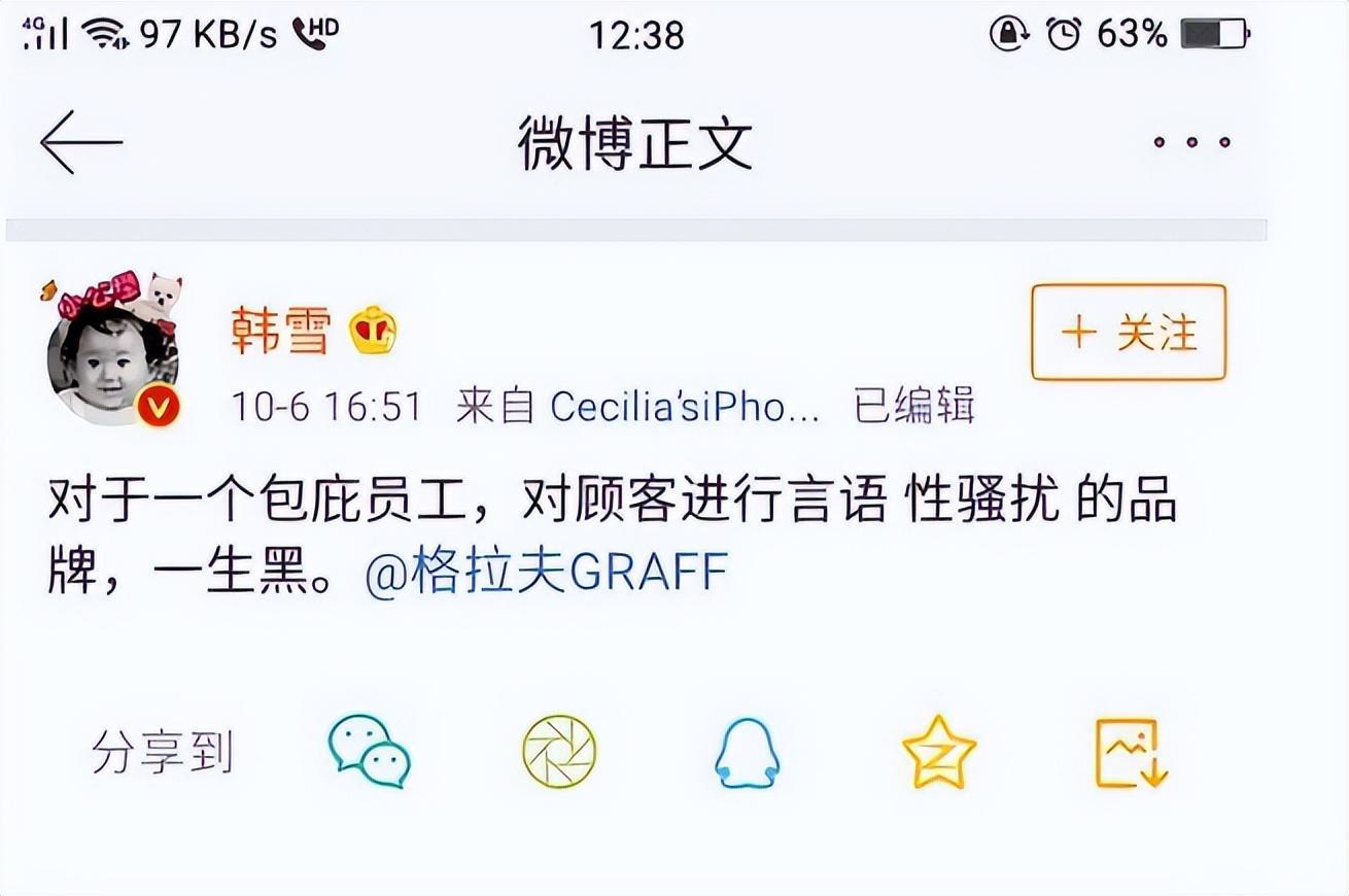 2018年 韩雪又在微博手撕格拉芙品牌方