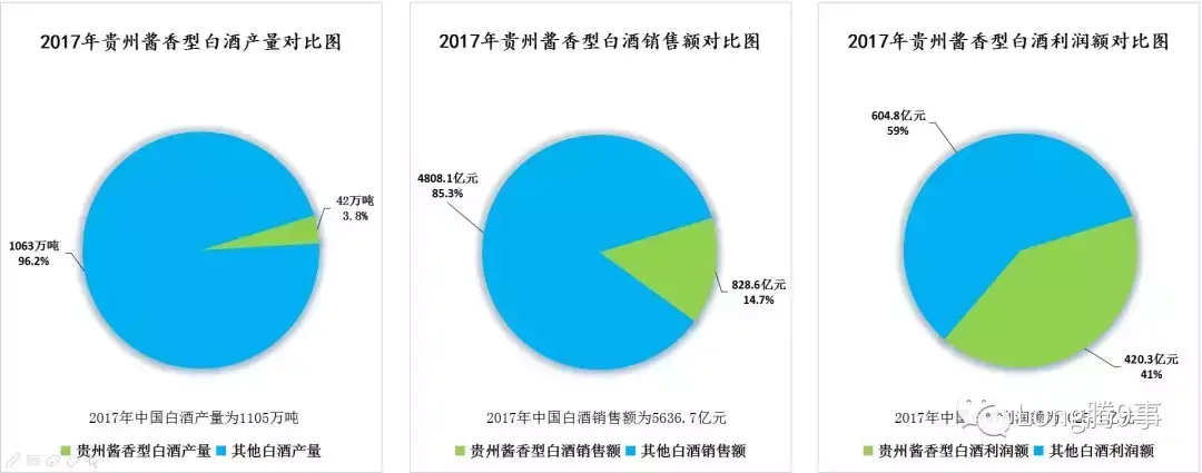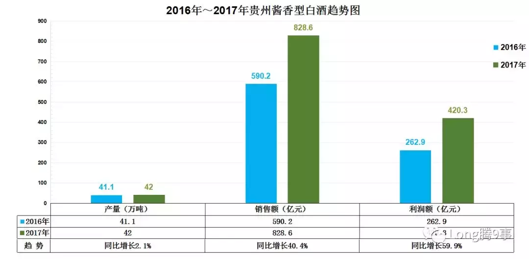 据中商情报网对2017年贵州白酒的数据分析得出:①产量42万吨(产值902.4亿元),同比增长2.1%,约占全国白酒产量的3.8%;②销售总额828.6亿元,同比增长40.4%,约占全国白酒销售总额的14.7%;③ 利润总额420.3亿元,同比增长59.9%;利润约占全国41%。
