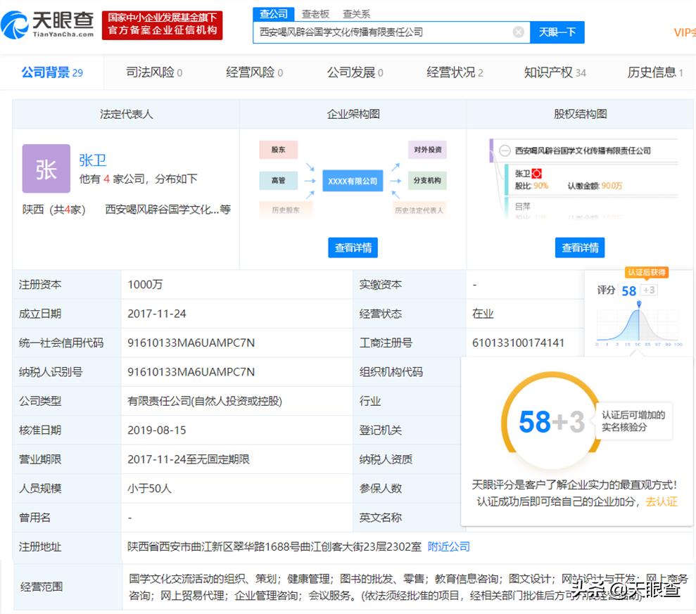 天眼查数据显示,西安喝风辟谷国学文化传播有限责任公司,成立于2017年,注册资本1000万元,张卫是公司的法定代表人,该公司的经营范围包括:国学文化交流活动的组织、策划;健康管理;图书的批发、零售;教育信息咨询;图文设计;网站设计与开发等。