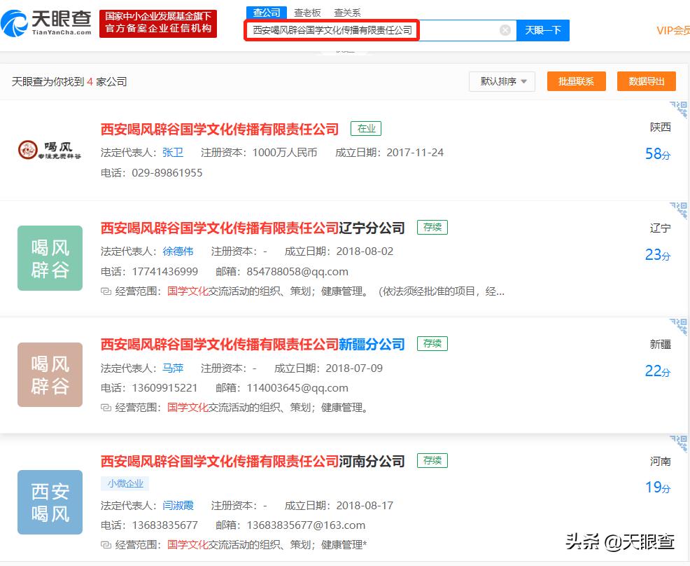 天眼查数据显示,除了西安喝风辟谷国学文化外,“喝风辟谷”还有三家分公司,分别为辽宁、新疆、河南的分公司。