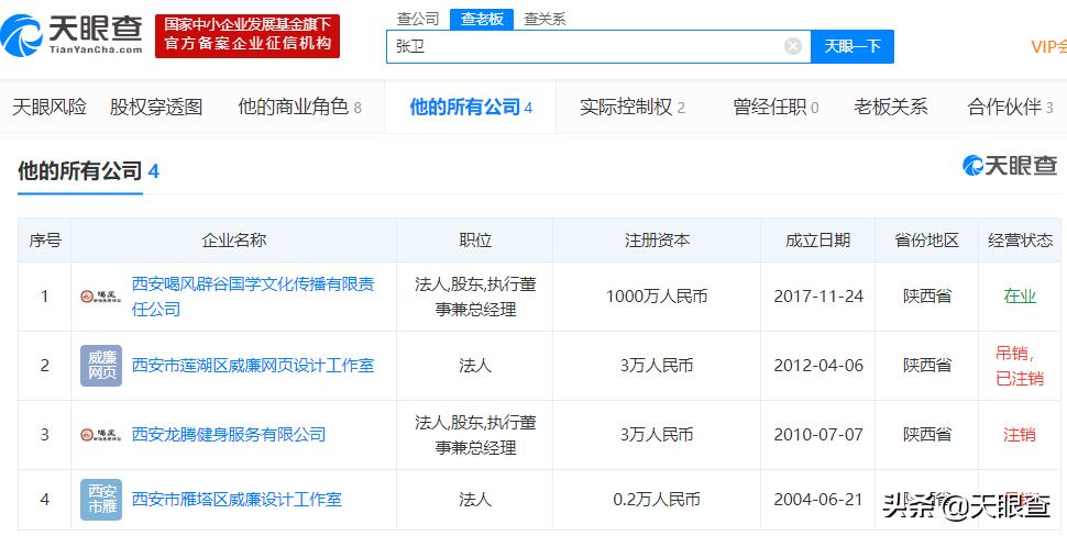 而该公司的法定代表人——张卫,除了担任西安喝风辟谷国学文化传播有限责任公司的法定代表人外,此前他还有三家公司,分别为西安市莲湖区威廉网页设计工作室、西安市龙腾健身服务有限公司、西安市雁塔区威廉设计工作室。