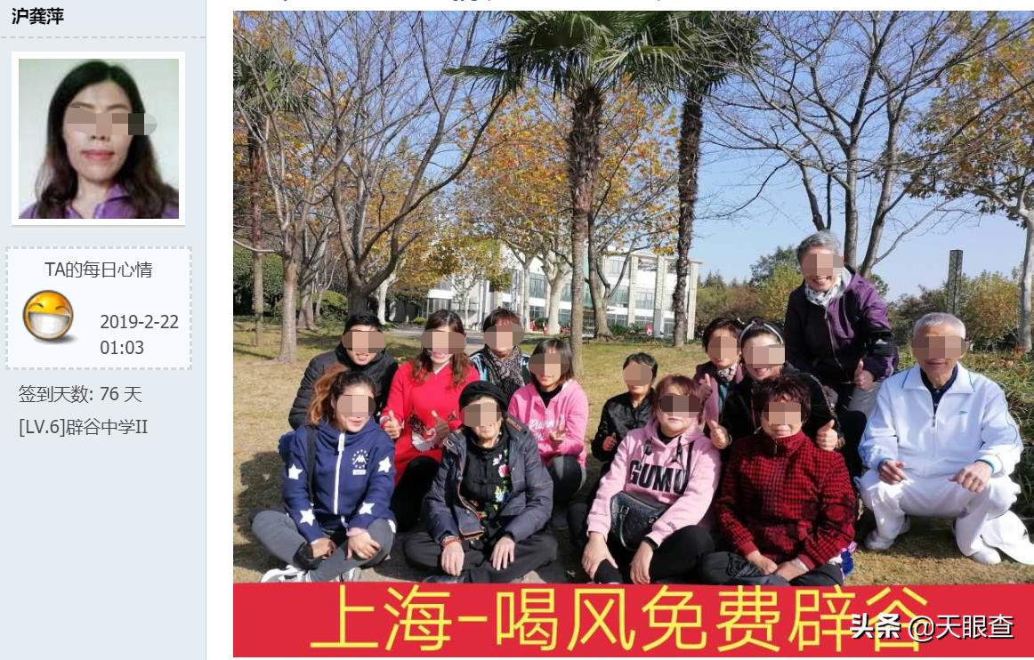 在一场上海的“喝风免费辟谷”见面会的合影留念中,天眼妹发现,包括所谓导师在内的人,均为中老年人。