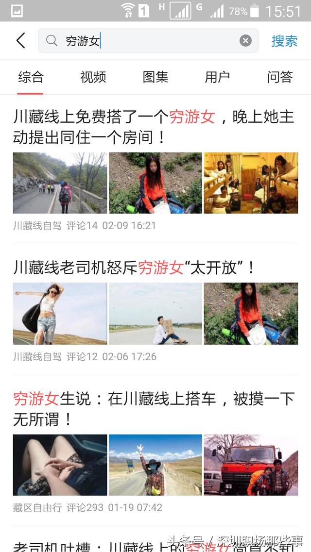 所谓川藏线“穷游女”,就是指那些自由行进藏,一路搭顺风车的女孩!而这些女孩,与川藏线,青藏线,亦或着是滇藏线,新藏线的司机之间,说不清道不明的关系!我试着在某自媒体平台搜索“穷游女”,结果如下: