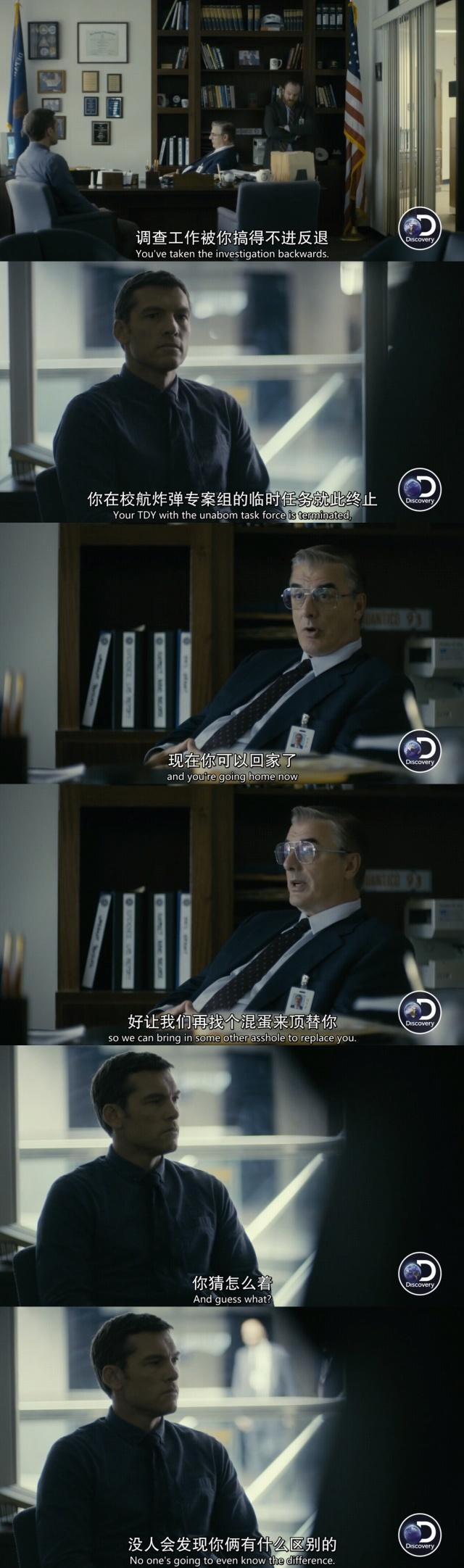 我不知道这部剧结尾这一幕想要表达什么。自始至终,它好像都同意炸弹客的观点,自由是被规则限制的。不可否认,FBI的一些规则妨碍了男主对炸弹客的追击。然而有些时候,规则是为了保证自由与尊严不受侵犯,真正限制自由的是人,是其他不守规则的人。