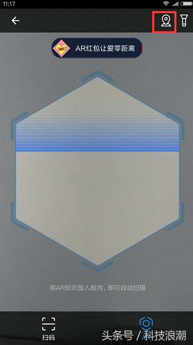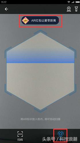 2、在扫一扫界面里选择右下角的“AR”选项,在弹出的界面里单击“AR红包让爱零距离”即可进入藏红包环节;