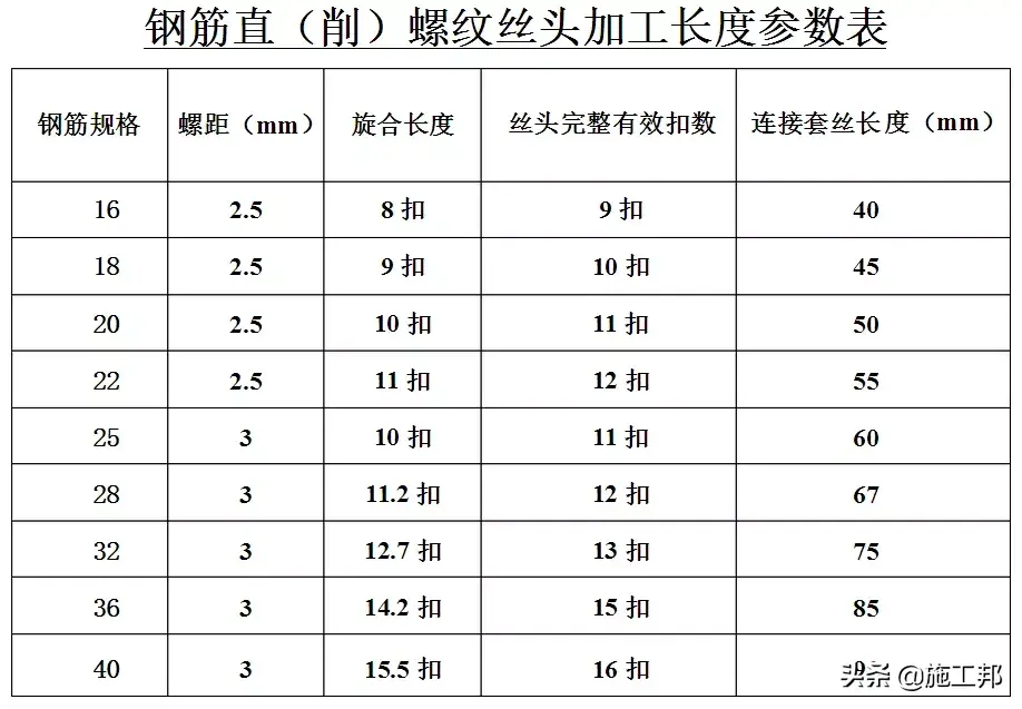 3、钢筋丝头的加工长度一般比公正差(套筒长度的一半)多两个丝(完整的丝扣圈数)。