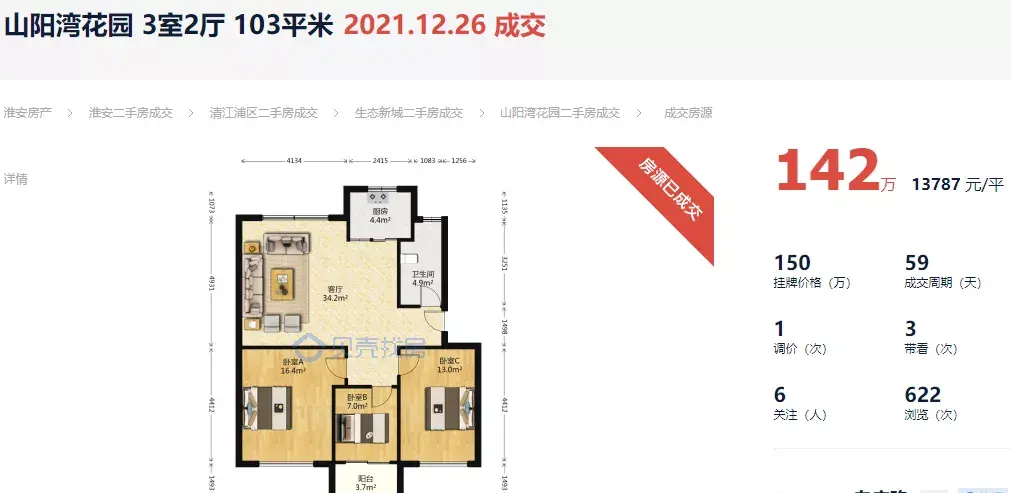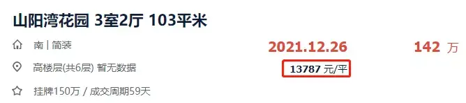 我在贝壳找房上看到,近日,生态新城山阳湾花园,成交了一套103㎡的小户型,成交单价约13787元/㎡,房主历经一次调价终于成交。