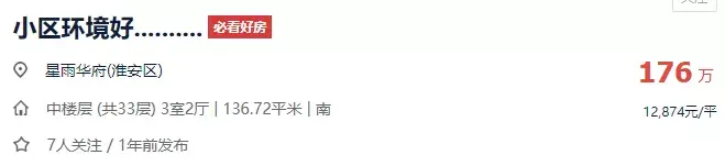 ②星雨华府,在售的136.72㎡的三房户型,单价仅1.29万/㎡,目前小区挂牌均价为1.62万/㎡,低于市场价超3000元/㎡。