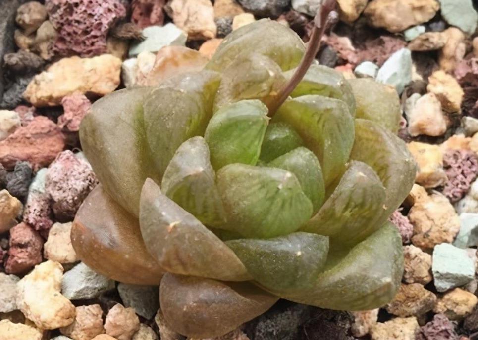 除了根系有原因,在养护的时候光照过强也会造成玉露的叶片干瘪,玉露和别的多肉植物不一样,它喜欢在明亮散射光的环境中养护,在紫外线不强的情况下,也可以适当的晒晒太阳。但是千万不要把它扔在外面阳光直射的环境中,不然它的叶片会晒到干瘪发皱,叶片发红发成灰褐色,特别的难看,一点都没有活力。