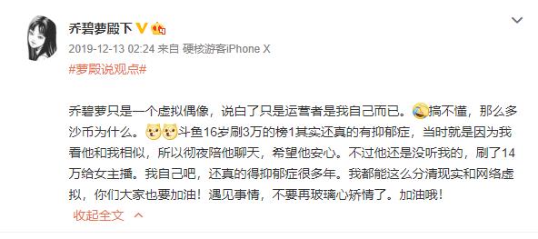除此之外,在乔碧萝身上还有一件大家不会忘记的事情,那就是“榜一”事件,据悉,在乔碧萝露脸之前榜一给乔碧萝刷了十万,露脸之后再无音讯。后续经乔碧萝证实:榜一其实只刷了3万,并没有10万这么多。