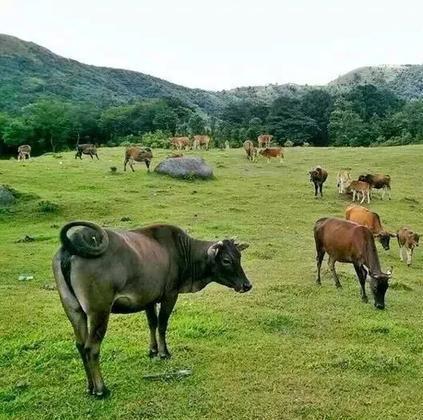 由于还没开发,这里保留了美丽的自然风光,村民放养的牛群。每逢农闲时节,牛群三三两两悠闲自在地漫步和吃草。