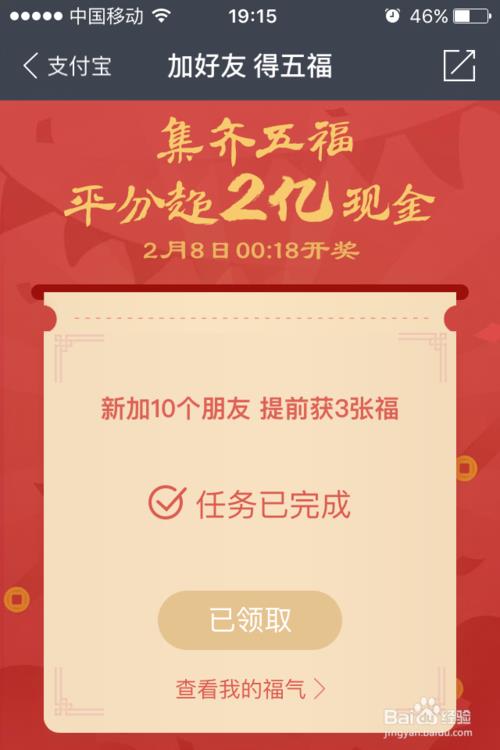 另外提醒,如果一个人有多个支付宝账户,可以自己加自己好友,每个支付宝账号都可以领到福,这样可以提升集齐福字的概率
