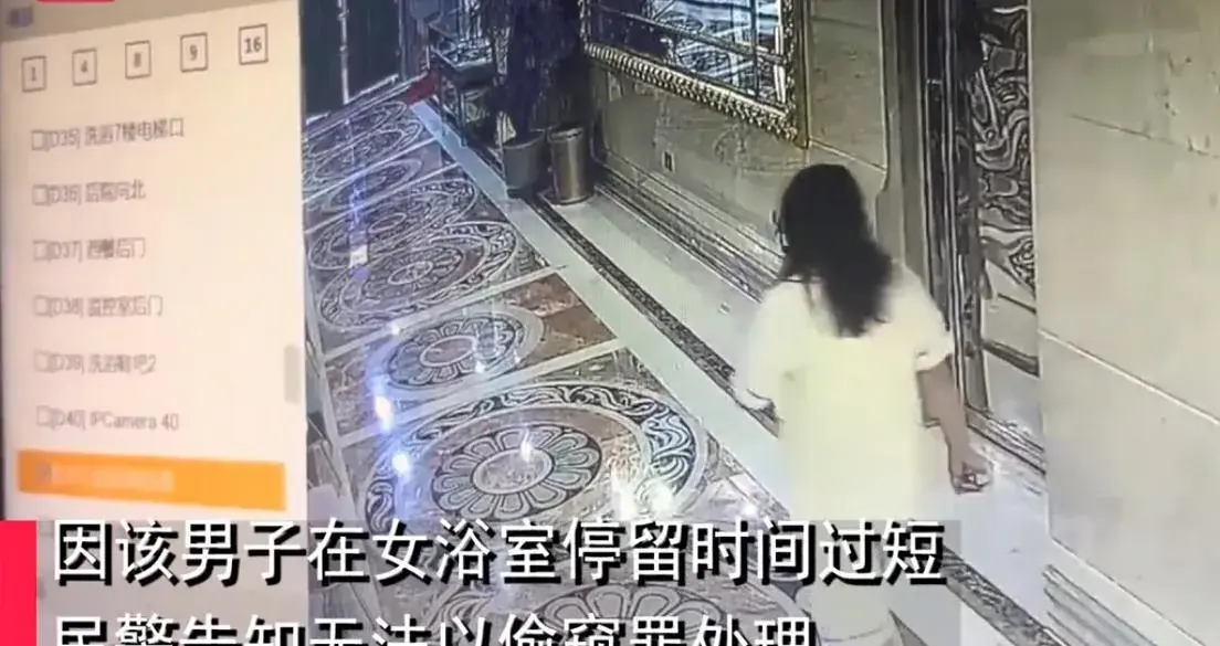 根据视频显示,一名男子穿着棉衣、提着手提包,脚穿拖鞋,推开门帘进入女浴室,几秒后又从里面走出来。