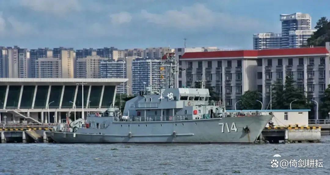 5、镇赉号082II型猎扫雷舰,舷号714,舰长55米,舰宽9.3米,标准排水量500吨,满载排水量575吨。