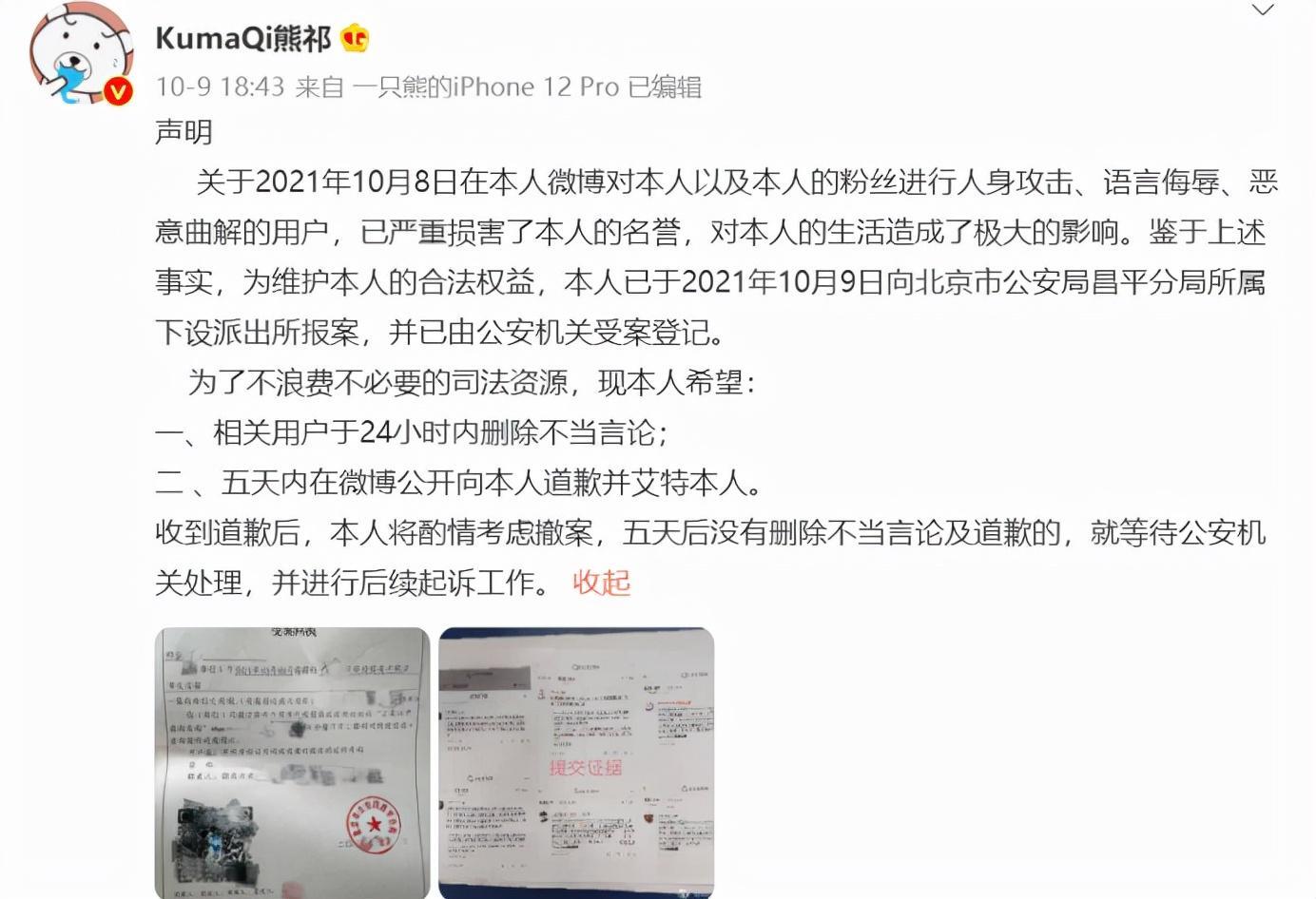 原来,熊祁最近发了一条微博,说她被好“闺蜜”冷冷安利了一个好看的动漫,自己正准备要看呢,冷冷却说这个动漫里有不和谐的元素,所以熊祁也就和冷冷开玩笑吐槽了一下,这下可捅了马蜂窝,这“不当言论”引发漫粉疯狂攻击,他们痛骂熊祁无知,有些漫粉骂得非常难听,还说熊祁这回也塌房了,这让熊祁也怒了,才把这些骂人的提交到警局,并让他们五天内给自己道歉。