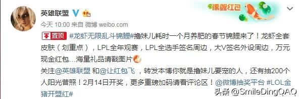 今天,10:00英雄联盟官微发布了“龙虾无限乱斗锦鲤”这么的一项目活动,奖品有龙虾全套皮肤,LPL全年观赛,LPL全选手签名周边,大V签名外设周边,万元现金红包等等!