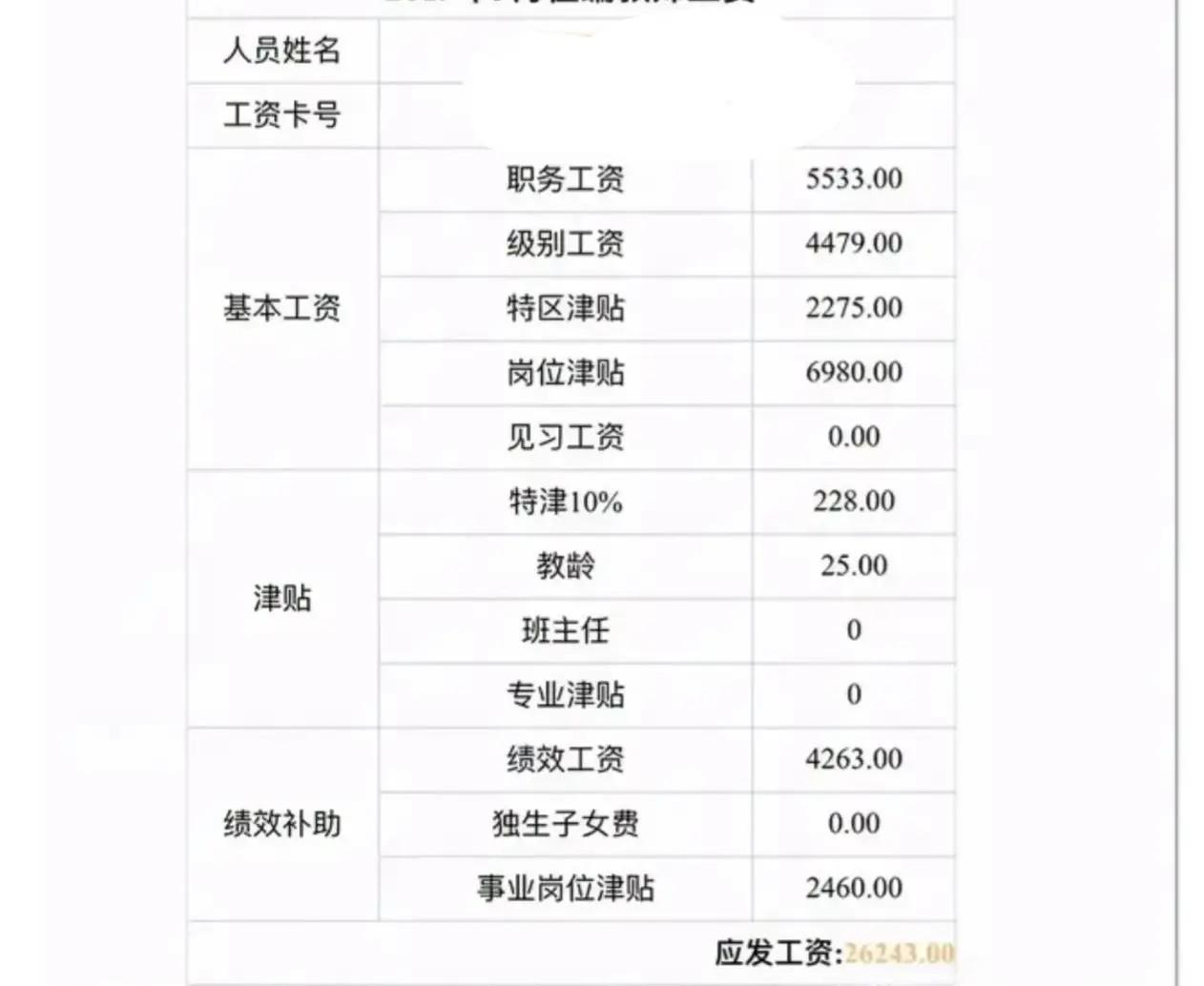 深圳一普通中学老师的工资表,这个工资还是让老师们比较满意的,基本工资加起来就差不多有两万了,再加上津贴和绩效补助,应发工资是26243元,基本上是在全国中学老师里面最高的了。