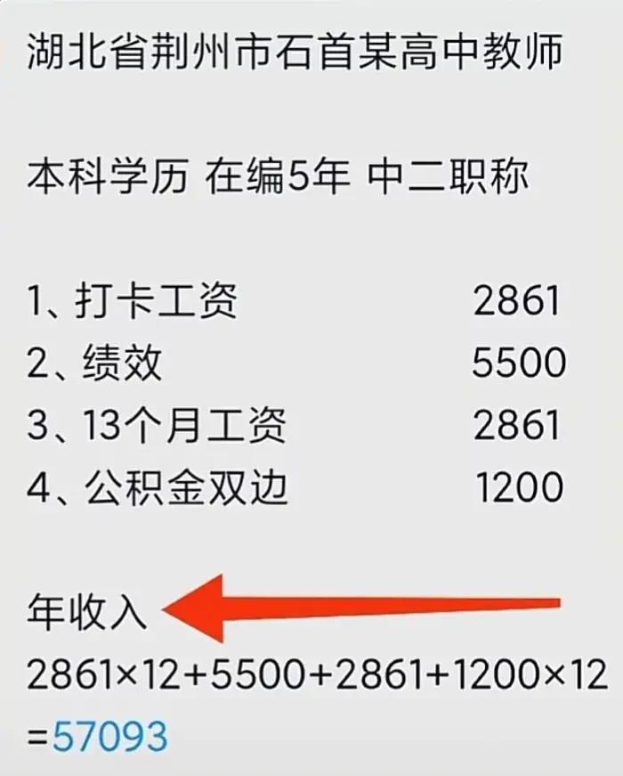 湖北荆州一高中老师的工资表,基本工资2861元,绩效工资一年5500元,公积金双边1200元,年收入57063元。