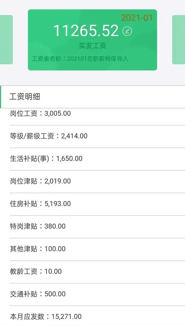 江苏也是发达的省份,这是江苏某地级市的一所中学老师的工资表,这名老师的基本工资并不高,值得注意的是住房补贴就高达5093元,仅这一项就可以抵得上很多人一个月的工资了。应发工资是15271元,扣除五险一金和个人所得税之后实际到手工资11265.52元,还是比较可观的一个收入。
