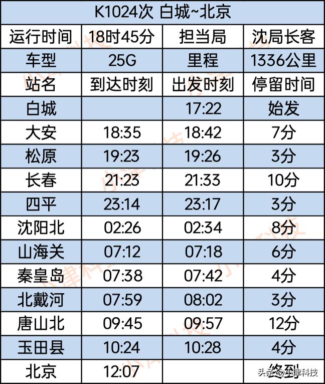 白城站至北京站K1024次运行18小时45分,经停白城、大安、松原、长春、四平、沈阳北、山海关、秦皇岛、北戴河、唐山北、玉田县、北京。