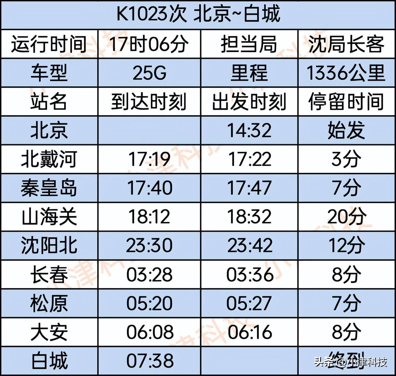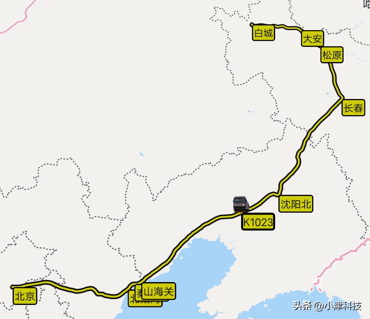 北京站至白城站K1023次运行17小时06分,经停北京、北戴河、秦皇岛、山海关、沈阳北、长春、松原、大安、白城。