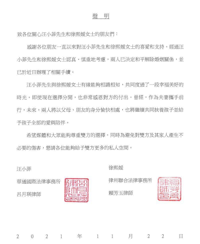 徐熙媛(大S)汪小菲在11月22日发声明承认离婚,引起轰动。