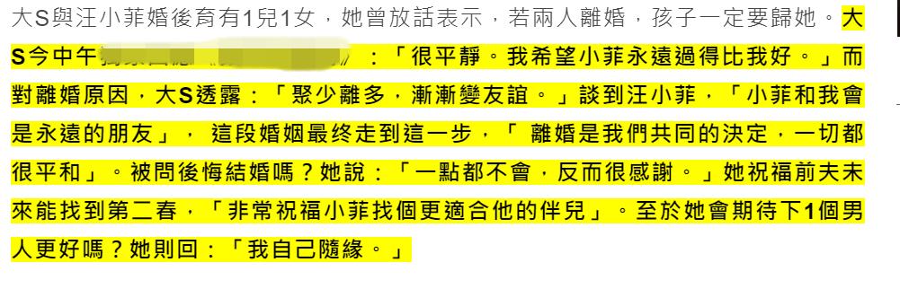 大S方面则强调,离婚后会共同抚养子女,她跟汪小菲永远都是孩子的父母,等待子女长大,会让他们自由选择生活的城市。