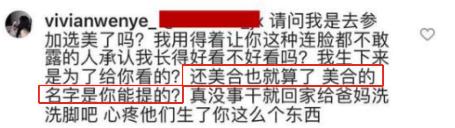 甚至,王文也还与一名网友产生摩擦,她用十分激烈的语言回怼对方,并优越感十足地称:“美合的名字是你能提的?”