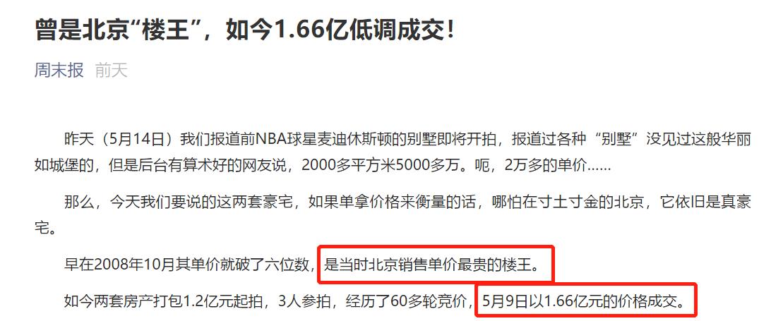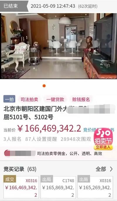 然而如今,这两套房产被北京法院送至司法拍卖,起拍价是1.28亿元,最终成交价仅1.66亿元。