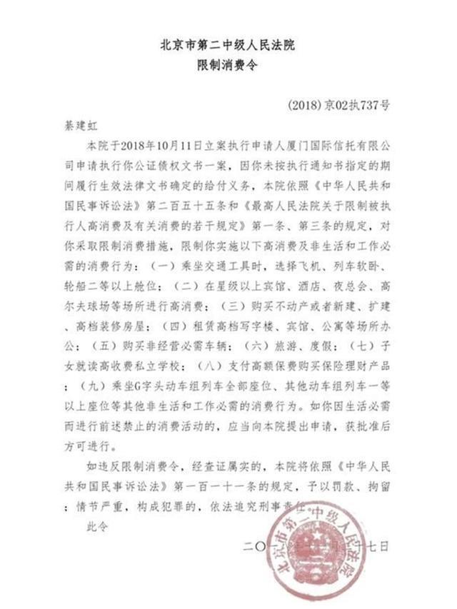 綦建虹本人也被列入失信被执行人名单,法院下发了“限制消费令”,百亿富豪一朝跌落成“老赖”。