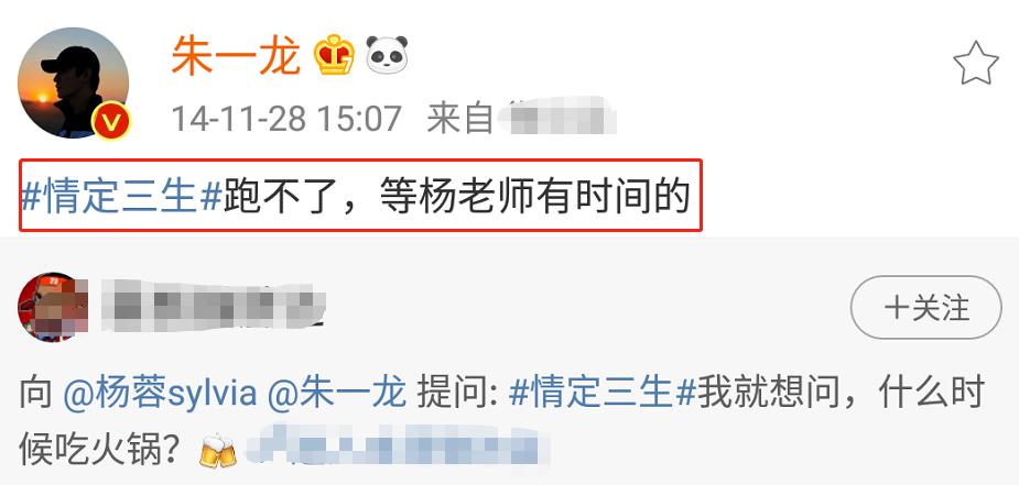 2013年7月《情定三生》开拍,一个女主一个男主,杨蓉还在自己的账号上发文调侃剧情和人设。这是朱一龙第一次出现在杨蓉账号,也是朱一龙第一次转发杨蓉动态,看语气他俩的关系应该挺不错。