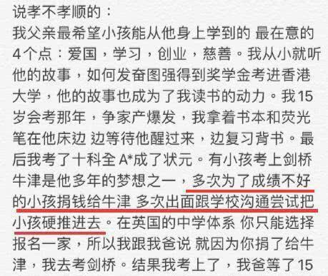 近日,何猷君发长文回应质疑,文中透露何鸿燊曾花钱给孩子上名校,自己则是凭借努力考上了大学。有网友猜测文中提到的孩子是何超盈,何猷君回复“不是何超盈,她成绩很好。”但不否认其他房的子女是花钱上好大学的质疑。