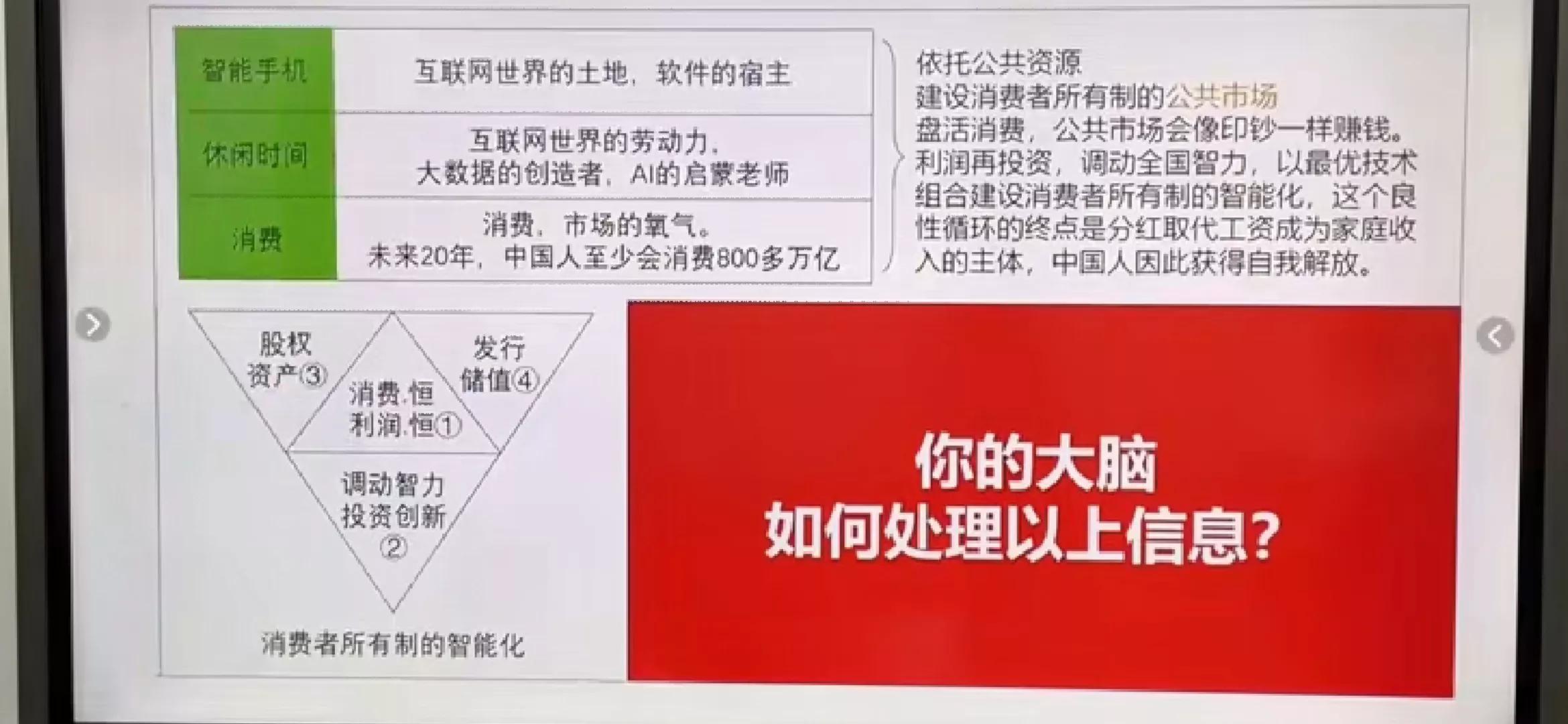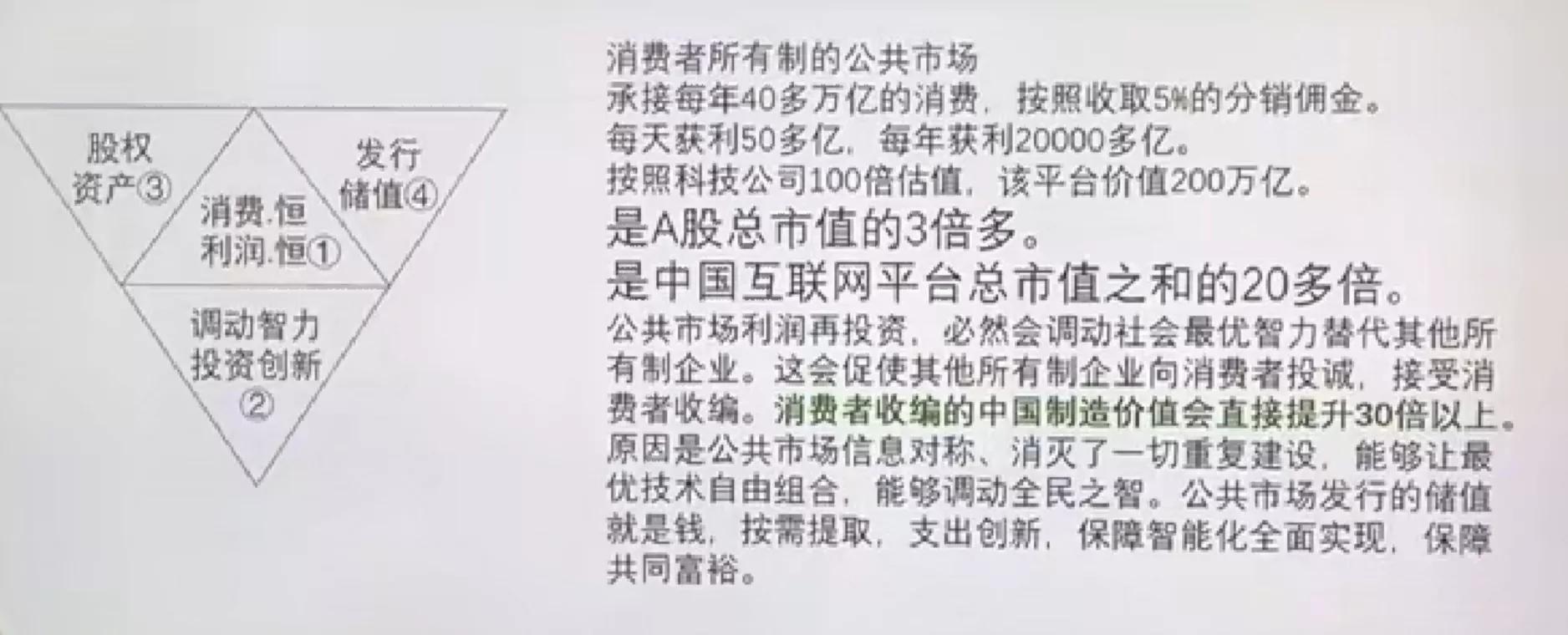 消费者所有制8/2的公共市场。承接每年40多万亿的消费。按照收取5%的分销佣金。每天获利50多亿,每年获利20000多亿。按照科技公司100倍的估值。该平台价值200万亿。是A股总市值的3倍多。是中国互联网平台总市值之和的20多倍。公共市场利润再投资,必然会调动社会的最优智力。替代其他所有制企业。这会促使其他所有制企业向消费者投诚。接受消费者收编。消费者收编的中国制造价值会直接提升30倍以上。原因是公共市场信息对称,消灭了一切重复性建设。能够让最优的技术自由组合。能够调动全民之智。公共市场发行的储值就是钱。按需提取。支出创新。保障智能化全面实现,保障共同富裕。