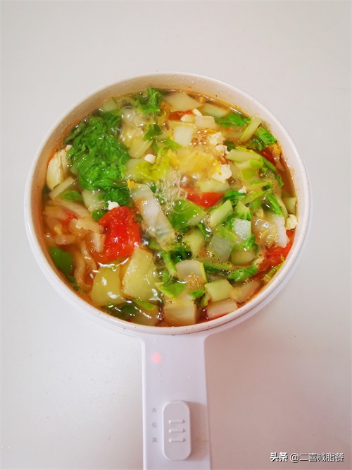 就着这个锅吃完了,省了洗碗,又是大量的水分和蔬菜。蛋白质用豆腐代替了,蔬菜汤的口感不错哦,不寡淡。