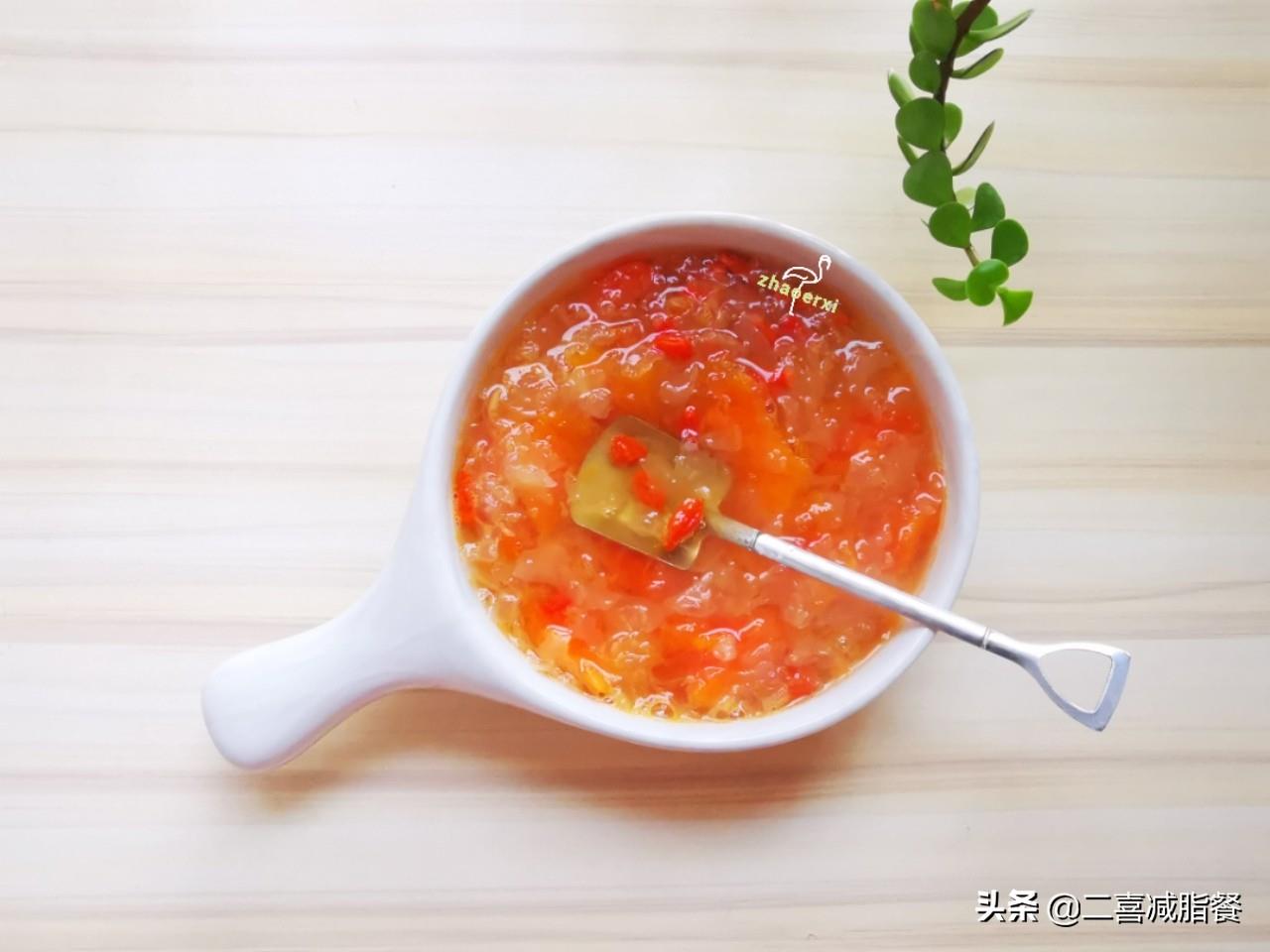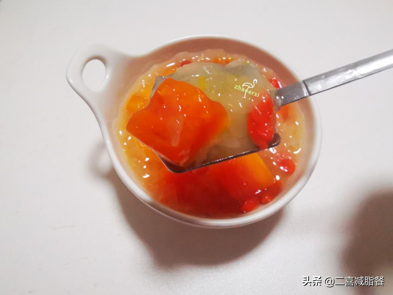 木瓜是热量很低的水果,100克只有30大卡,但维生素C含量很高,和银耳软糯的口感很配,是一道低脂又健康的甜品。