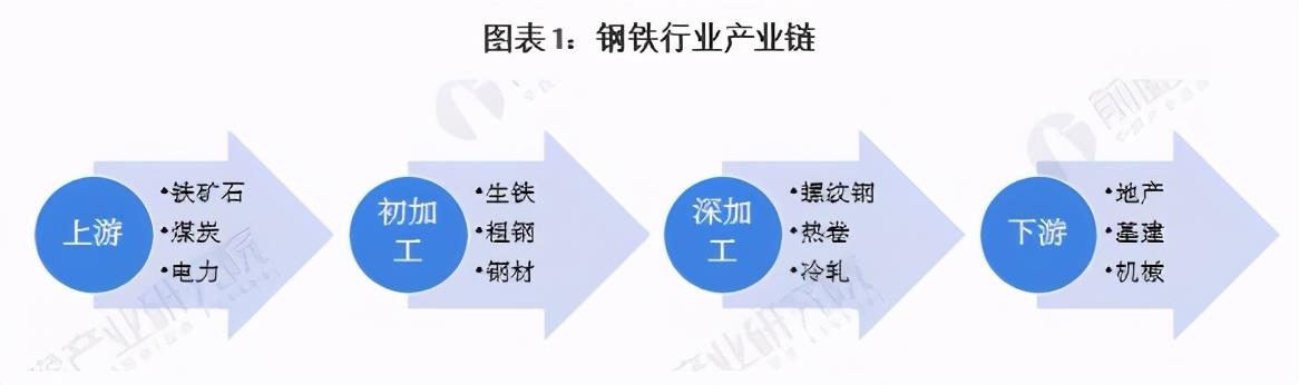 从钢铁产业链的角度来看,钢铁行业属于中游行业,上游主要为铁矿石、煤炭、焦炭、动力(电力)等,钢铁的下游应用广泛,钢铁产品作为基础原料,在地产、基建、机械、汽车、造船、家电等几乎所有行业中被大规模使用。从单价600元左右的煤炭、煤炼焦产出的单价2000元左右的焦炭、再到煤焦、矿石炼钢产出单价4000元左右的钢材。有的大型钢厂配套有炼焦厂和矿山,产业链较完备。