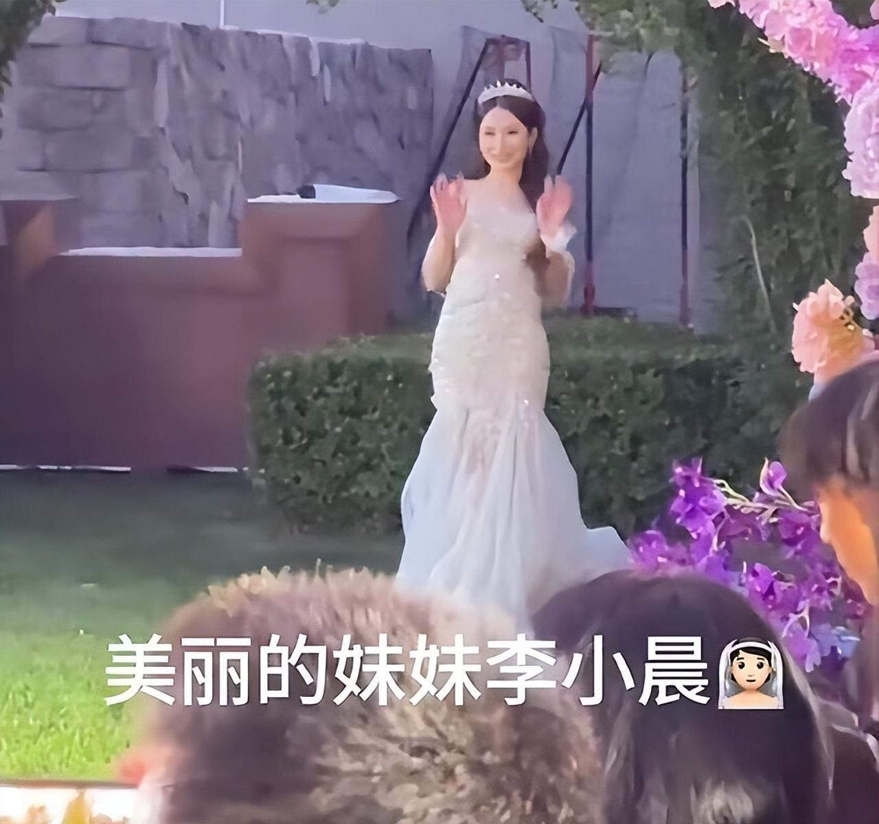 人群中,身穿洁白婚纱的李小晨,笑靥如花,甜蜜地挽着新郎的手臂。