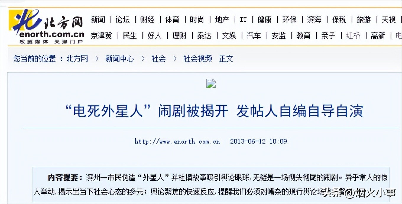 1、“电死外星人”闹剧被揭开 发帖人自编自导自演 北方网 2013年6月12日发布