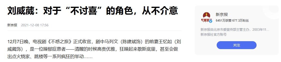 信息来源:2021年12月8日发表于新京报——《刘威葳:对于“不讨喜”的角色,从不介意》