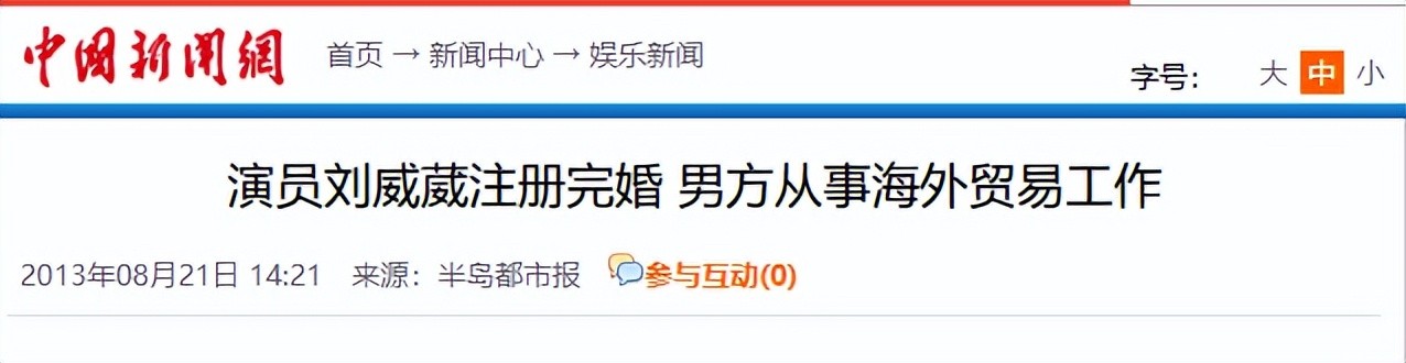 信息来源:2013年8月21日发表于中国新闻网——《演员刘威葳注册完婚 男方从事海外贸易工作》