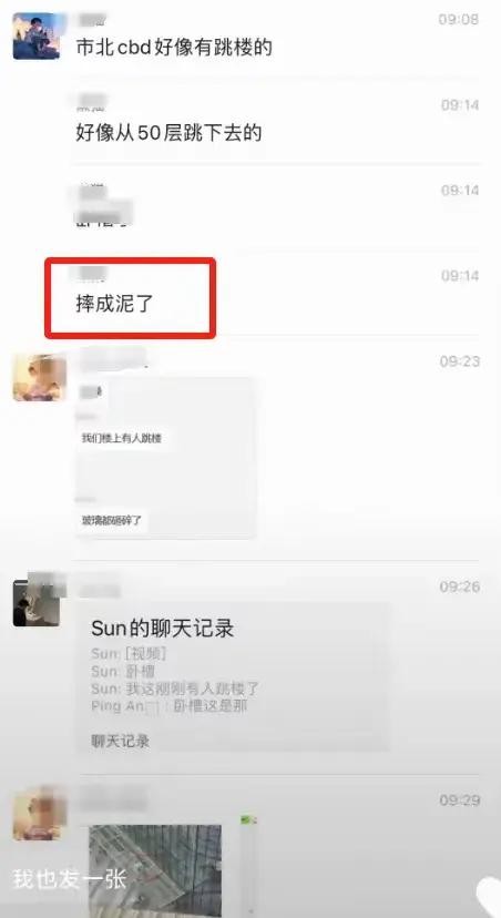 据悉,女子跳楼的楼层是58楼,从这个高度跳下去,基本没有生还的可能。网传的图片显示,女子整个身体已经被摔扁,有微信群网友爆料,女子当场被摔成了肉泥,现场非常凄惨。让人奇怪的是,女子上身只穿着内衣,这个细节引起了网友种种猜测。