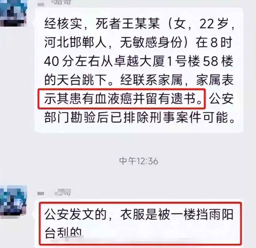 有一个知情的网友发布了更详细的信息,提到死者是河北邯郸人。家属表示,这个女孩患有血液病,并且留下了遗书。家属称女孩是在青岛工作,不是这栋楼的员工,生前已经确诊患有血液病(比较常见的就是白血病,一种恶性肿瘤),感到治愈无望,也无法面对和承受疾病带来的痛苦和精神打击,所以有了轻生的想法。