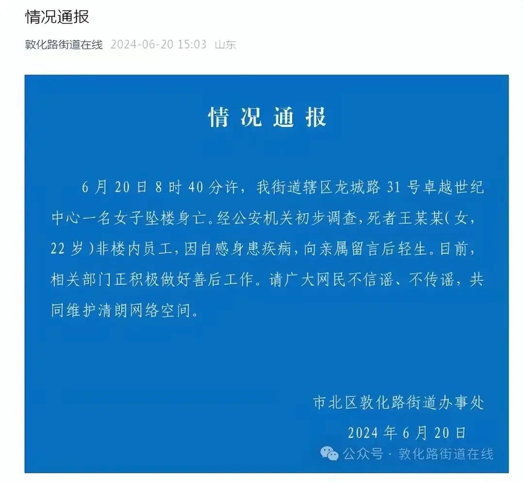 官方通报显示,经公安机关初步调查,死者王某某并非楼内员工,因自感身患疾病,向亲属留言后轻生。由此可见,王某某的轻生并非网上传闻的种种原因所致。