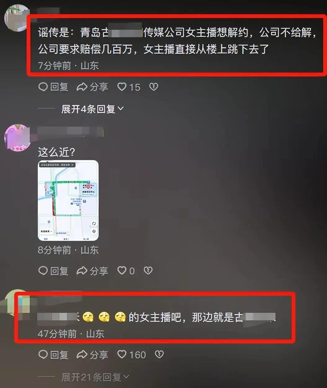 还有网友表示:“这个楼里传媒公司也非常多,传媒公司通常都签约很多女网红,女子之所以跳楼,是因为想与公司解约,被公司讹诈几百万,无奈之下才跳楼寻死。”