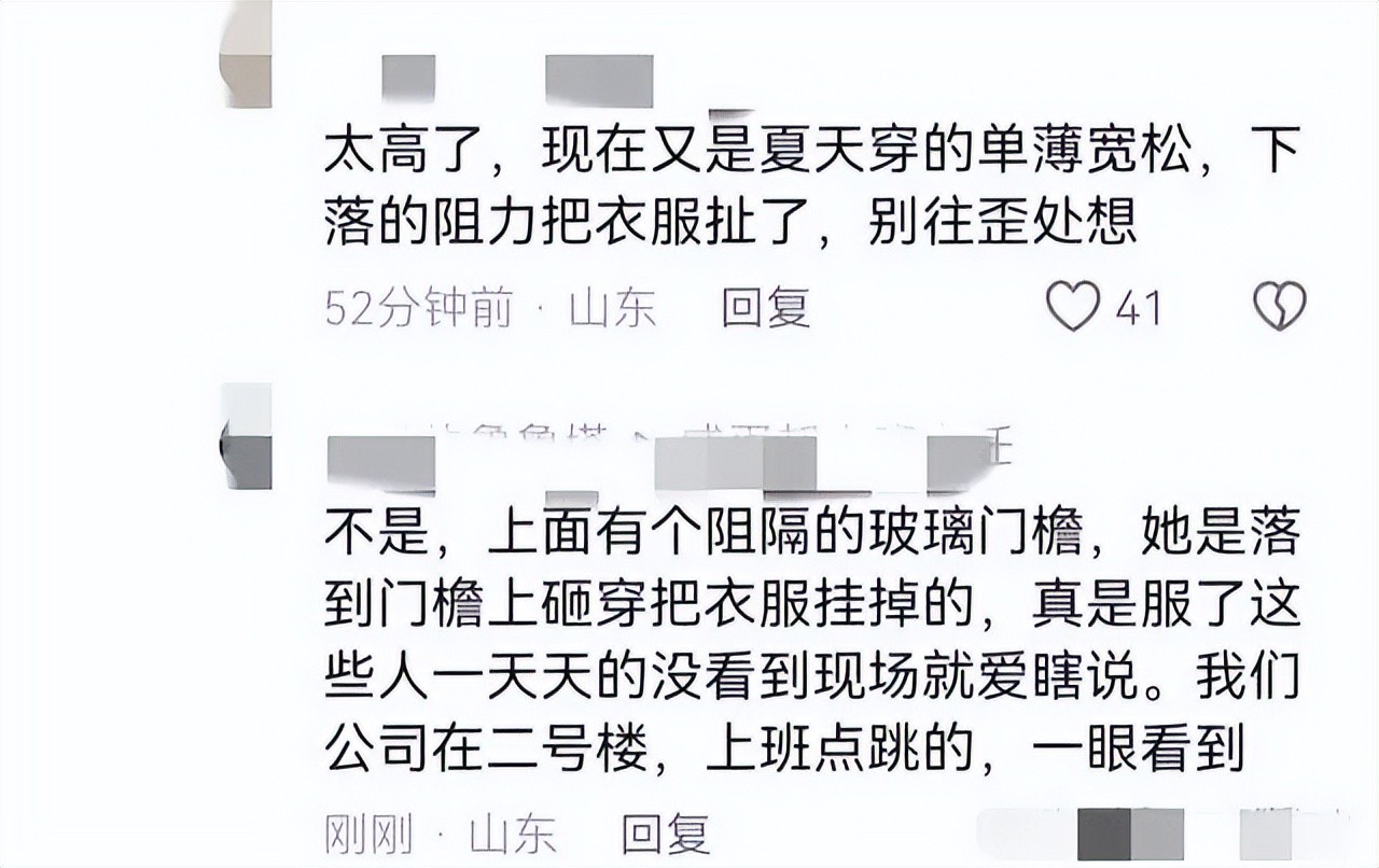 另外还有网友猜测:“女子跳楼的时候衣衫不整,不会是受到了某种胁迫,才跳楼自杀的吧。”